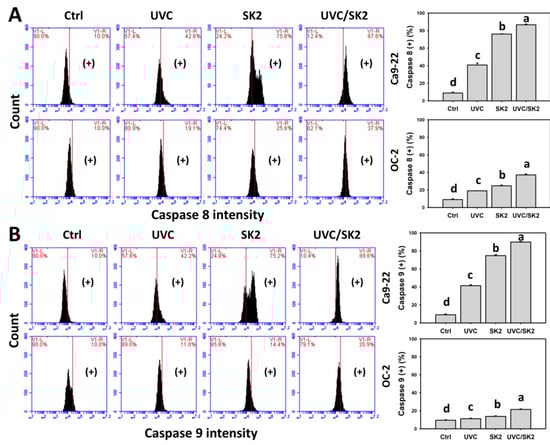 Caspase 8 and caspase 9, the extrinsic and intrinsic apoptotic caspases, were assessed by flow cytometry (Figure 8). UVC/SK2 showed higher caspase 8 and caspase 9 (+) counts in oral cancer cells (Ca9-22 and OC-2) than in single treatment (Figure 8A,B). Moreover, caspase 8 (+) counts were higher than caspase 9 (+).