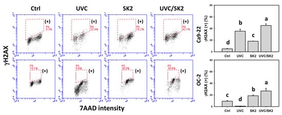 γH2AXassays. Oral cancer (Ca9-22 and OC-2) cells were treated with control, UVC (20 J/m2), SK2 (10 μg/mL), and UVC/SK2 (20 J/m2 and 10 μg/mL). Box regions are marked with (+). Data indicate means ± SD (n = 3). The statistics of multiple comparisons were performed. The significance was judged from the connecting letters between different groups, i.e., it showed a significant difference when the connecting letters were not overlapped (p < 0.05). For the example of Ca9-22 cells, the connecting letters for control, UVC, SK2, and UVC/SK2, showing d, b, c, and a, indicated a significant difference between each other because they were not overlapped.