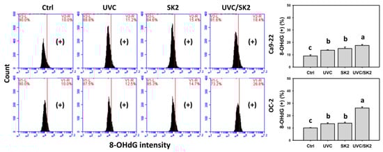 8-OHdG assays. Oral cancer (Ca9-22 and OC-2) cells were treated with control, UVC (20 J/m2), SK2 (10 μg/mL), and UVC/SK2 (20 J/m2 and 10 μg/mL). 8-OHdG (+) regions are marked with (+). Data indicate means ± SD (n = 3). The statistics of multiple comparisons were performed. The significance was judged from the connecting letters between different groups, i.e., it showed a significant difference when the connecting letters were not overlapped (p < 0.05). For the example of Ca9-22 cells, the connecting letters for control, SK2, and UVC/SK2, showing c, b, and a, indicated a significant difference between each other because they were not overlapped. UVC and SK2, showing b, indicated nonsignificant differences because their connecting letters were overlapped.