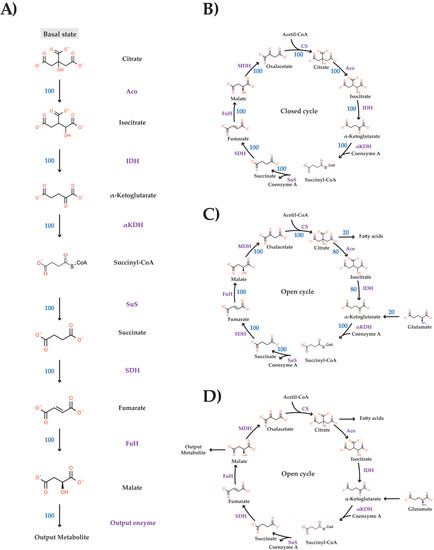 The occurrence of anaplerotic routes that refill the TAC and the use of some metabolites of the cycle for biosynthetic purposes are well-known. Accordingly, we modelled the cycle depicted in Figure 1C, in which the cycle has an input flux (IF) at the level of α-ketoglutarate and an output flux (OF) at the level of citrate. With only one input reaction and one output reaction, any SS requires that the input reaction flux (i.e., IF) be the same as the output reaction flux (i.e., OF). Hence, we assumed that the IF and OF were equal to 20 (in arbitrary units). Hence, the enzyme activity for the reactions between α-ketoglutarate and citrate was set at 100 and the flux through the remaining reactions was set at 80 (see Figure 1C).