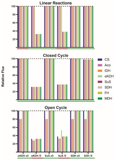 The closed version of the TAC is shown in Figure 1B. The flux is arbitrarily set to 100, but the numerical value of the flux does not affect the qualitative results nor the intermediate concentrations in SS or through dynamic processes. Accordingly, we have proceeded to calculate the Vmax leading to an IC flux of 100 using the metabolite concentrations displayed in the literature (Table 1) and the equations for each enzymatic step indicated in Supplementary Material. This will be considered the reference condition or “control” TAC. Subsequently, we perturbed this SS (enzyme rate/activity for each TAC step set to 100) and metabolite concentrations given in Table 1 by varying the catalytic level/activity of the enzymes or the concentration of metabolic intermediates. After every perturbation, the simulation was performed until an SS was achieved either “returning” to the initial one or “going” to a new SS. It is anticipated that in a closed TAC, the SS can always be achieved.