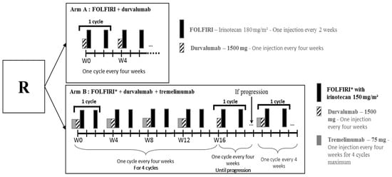 Treatment was repeated every 2 weeks until disease progression, unacceptable toxicity, death, withdrawal of consent or patient refusal. Dose adjustment was based on toxicity according to standard guidelines for FOLFIRI. Dose reduction was not allowed for durvalumab and tremelimumab.