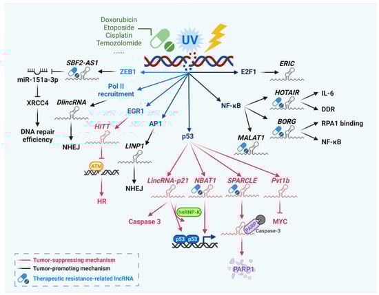 The development of anti-cancer treatments with genotoxic agents such as ionizing radiation and chemotherapeutics is based on the inability of cancer cells to efficiently repair DNA damages. However, cancer cells with intrinsic or acquired resistance to DNA damage-induced cytotoxicity are less sensitive to genotoxic stress, rendering poor clinical outcomes in patients undergone genotoxic therapies [27,39]. Evidence has piled up to show that lncRNAs play a role in the resistance to genotoxic therapies. BORG is highly responsive to multiple chemotherapeutic agents such as doxorubicin or 5-fluorouracil (5-FU) and leads to chemoresistance by sustaining the activation of NF-κB [40]. MALAT1 is co-activated by NF-κB and p53 following the treatment of temozolomide (TMZ) in glioblastoma (GBM) and promotes resistance to TMZ [41]. SBF2-AS1 is activated by zinc finger E-box binding homeobox 1 (ZEB1) and regulates the XRCC4-mediated DSB repair machinery by sponging miR-151a-3p. This protective effect is amplified by exosomal SBF-AS1 secretion to influence the neighboring GBM cells [42]. Moreover, lncRNAs can control cell fate depending on the degree of stress. Nrf2-lncRNA is induced by p53 upon weak DNA damage and promotes the expression of itself and Plk2/p21cip1 by competing with miR-128 and miR-224, further leading to the upregulation of nuclear factor erythroid 2-related factor 2 (NRF2) and cell growth. In contrast, stronger DNA damage dampens the p53-mediated transcriptional enhancement of Nrf2-lncRNA [43].