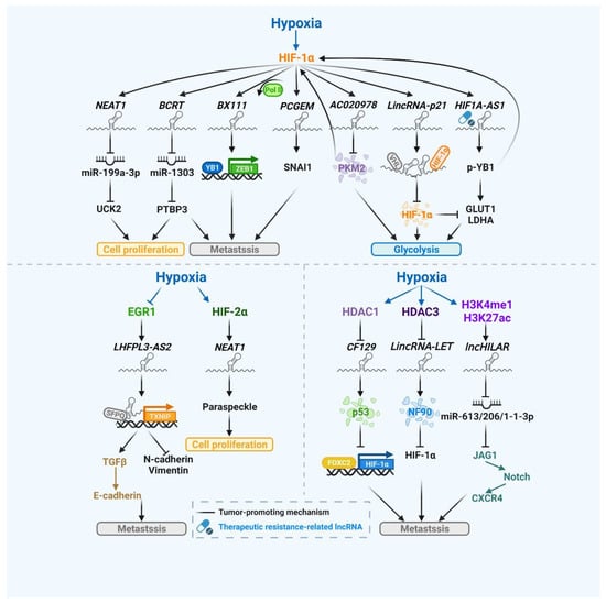 In addition to the major role of HIF-1α in regulating hypoxic stress signaling, other hypoxia-responsive transcription factors also play important roles in the hypoxic response [47]. In BC, NEAT1 is transcriptionally upregulated by HIF-2α under hypoxia and regulates the nuclear structure, further contributing to BC cell proliferation [65]. LHFPL-AS2, a tumor-suppressive lncRNA in lung cancer, is downregulated under hypoxia due to the reduction in EGR1 expression, resulting in the transcriptional repression of thioredoxin-interacting protein (TXNIP) and promoting tumor metastasis [66].