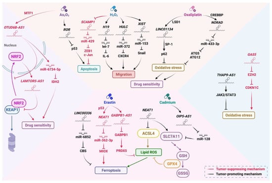 NRF2, one of the most important antioxidant transcription factors, binds to antioxidant response element (ARE) to regulate a series of antioxidant genes, which is responsible for producing antioxidants such as glutathione (GSH) or thioredoxin [69]. Some lncRNAs are reported to be involved in the NRF2-regulated signaling pathway. For example, lncRNA LAMTOR5-AS1 is upregulated by NRF2 in chemo-sensitive cells. LAMTOR5-AS1 regulates the interaction between NRF2 and Kelch-like ECH-associated protein 1 (KEAP1) to inhibit NRF2 transcriptional activity under chemotherapeutic drugs treatment, which finally results in an increase in drug sensitivity in osteosarcoma [70]. LncRNA OTUD6B-AS1, which is induced by metal-regulatory transcription factor 1 (MTF1) after the treatment of arsenic trioxide (As2O3), retains NRF2 in the cytoplasm to inhibit its function. On the other hand, OTUD6B-AS1 improves the stability of miR-6734-5p, a miRNA that targets isocitrate dehydrogenase 2 (IDH2) through direct binding to decrease the expression of IDH2. The inhibition of NRF2 function and IDH2 expression leads to the accumulation of oxidative stress and the cytotoxicity under As2O3 treatment in bladder cancer [71].