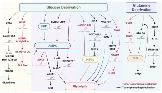Cancer cells are featured of their high demand of nutrients since they have to proliferate and grow rapidly. Nonetheless, the limited vascularization in the core of a solid tumor often results in the deficiency of nutrients in the tumor microenvironment [88,89]. The inability of consuming enough nutrients due to the insufficient nutrient supply or the high demand of nutrients causes stress to the cancer cells, which is denoted as metabolic stress [90]. During tumor development, cancer cells often undergo metabolic reprogramming in order to support their rapid growth or survive from the metabolic stress [91]. Although a number of studies have already indicated the role of lncRNAs in regulating metabolic reprogramming [92] and cancer metabolism [93,94], here, we are focusing on how cancer cells respond or confront to metabolic stress through these nutrient deficiency-responsive lncRNAs (Figure 4).