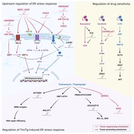 In multiple cancers, lncRNAs have been demonstrated to participate the UPR cascades in different aspects (Figure 5). Some lncRNAs are involved in the initiation of UPR by regulating the expression or the activation of UPR sensors. The overexpression of lncRNA MEG3 [121,122] and GAS5 [123] increases the expression of GRP78, IRE1, PERK, and ATF6, which may further trigger apoptosis to suppress tumor growth. LUCRC, highly expressed in colorectal tumor tissue to promote proliferation, migration and invasion of tumor cells, is required for the expression of BiP and the cleavage of XBP1 and ATF6 to evoke UPR [124]. CASC2 increases PERK mRNA stability to trigger the PERK/pS51-eIF2α/CHOP (C/EBP homologous protein) axis, which induces apoptosis in irradiated NSCLC cells [125]. MIR503HG, a miRNA sponge, increases TUSC3 expression by sponging miR-224-5p. The increase in TUSC3 further inhibits ATF6-mediated UPR and decreases cancer cell viability, proliferation and epithelial–mesenchymal transition (EMT) [126]. LINC00963 can sponge miR-320a, which directly targets XBP1 3′-UTR to abrogate XBP1 expression. As a result, when LINC00963 sponges miR-320a, XBP1-mediated UPR enhances apoptosis in GC [127]. On the other hand, ER stress can act as a stimulator of some lncRNAs. GAS5 is a lncRNA that is suppressed by ZBTB7A under normal conditions in osteosarcoma cells. When the UPR is activated by ER stress inducers, tunicamycin (Tm) and thapsigargin (Tg), ZBTB7A is downregulated and results in the increase in GAS5 to promote apoptosis [128]. MALAT1, one of the most well-characterized lncRNAs, is found to be induced by Tg and may be regulated by XBP1 and ATF4 to increase cell migratory abilities under ER stress in colorectal cancer cells [129]. GOLGA2P10 is found to be increased in HCC and is regarded as an oncogenic lncRNA. Under Tm or Tg treatment, GOLGA2P10 is upregulated by the PERK/ATF4/CHOP axis to increase BCL-xL expression and BAD phosphorylation, which decreases ER stress-induced apoptosis to assist cells in confronting ER stress [130]. LncRNA HITTERS, which is also upregulated by Tm or Tg, functions as an RNA scaffold to promote the interaction of the MRN complex. As ER stress can trigger DNA damage and may further induce apoptosis, the increase in MRN complex interactions can maintain DNA repair efficacy to prevent ER stress-induced apoptosis, which suggests that HITTERS is a pro-survival molecule in UPR [131]. In addition to participating in the regulation of UPR, some lncRNAs have been shown to either sensitize or counteract the efficacy of ER stress-inducing chemotherapeutic or targeted therapeutic agents. A potent anti-cancer agent resveratrol initiates UPR and enhances the expression of lncRNA H19. The combination of resveratrol and knockdown of H19 increases the expression of ER stress-related genes, promotes cell death and decreases EMT-related genes, suggesting the role of H19 in resveratrol-resistant GC cells [132]. Sorafenib, as a first line protein kinase inhibitor for treating advanced HCC [133], can induce UPR signaling to trigger apoptotic cell death with the assistance of lincRNA-p21 [134]. This study indicates that lincRNA-p21 is a tumor suppressive lncRNA in HCC and contributes to the activation of UPR signaling and apoptosis under sorafenib treatment. Another lncRNA ZFAS1 is shown to be upregulated by PERK/ATF4 axis after sorafenib treatment in sorafenib-resistant HCC cells, which suggests that ZFAS1 may be a therapeutic or prognostic biomarker of sorafenib treatment in HCC patients [135]. 5-FU is one of the most commonly used anti-cancer drugs which is mis-incorporated into RNA and DNA and further leads to cell death [136]. In 5-FU resistant cells, lncRNA MIAT is found to be upregulated. Mechanically, 5-FU evokes UPR and upregulates MIAT through the GRP78/octamer-binding transcription factor 4 (OCT4) pathway to confer 5-FU resistance in BC cells [137].