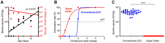 C. difficile colonization is inversely correlated with the acquisition of environmental Bacillus. (A) C. difficile colonization in piglets decreased following environmental exposure after birth. Fecal samples of neonatal piglets were collected during days 1–13 following birth. C. difficile (red circles) and Bacillus spores (black circles) were enumerated from the same fecal sample, from each individual piglet. A statistically significant negative correlation (Spearman’s rank-order) was observed between counts of C. difficile and Bacillus spores in pig fecal samples (rs = −0.5464, p = 0.0127). A significant correlation also existed between days passed for both Bacillus (rs = 0.9270, p = 0.0001), and C. difficile counts (rs = −0.5138, p = 0.0205). The average for each sample from two CFU measurements was used; (B) Mice habituating in ‘super clean’ conditions were more susceptible to clindamycin-induced C. difficile colonization than ‘conventionally caged’ mice. Mice (n = 5/gp) kept in ‘super clean’ (IVC; sterile food, water and bedding) or ‘conventional cages’ (CC; non-sterile food, water and bedding) for 1 year were challenged with CD630 after dosing with various concentrations of clindamycin. Colonized animals were confirmed by enumerating ethanol-resistant C. difficile in cecum 24 h post-challenge. Mice with counts >103 CFU/g were considered colonized. The IC50 of IVC (‘super clean’) and CC mice were 0.8 mg/kg and 2.0 mg/kg, respectively; (C) Bacillus spores were absent in fecal samples of ‘Super clean’ mice. Fecal samples were collected before the challenge study (panel B), heated at 65 °C for 45 min., dilutions plated on LB and enumerated after incubation for 2 days at 37 °C. Significance calculated using an unpaired t-test. ****, p < 0.0001.