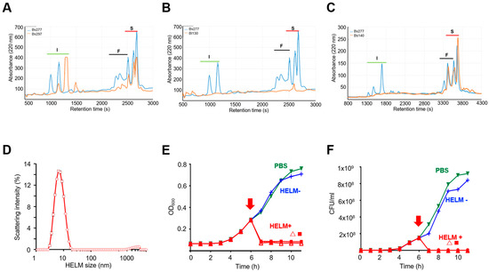 Bacillus-produced heterogenous lipopeptide lytic micelles (HELM) particles kill C. difficile. (A–C), SEC fractions from strains of three ‘active’ strains of Bacillus: B. velezensis strain Bv297 (A); B. licheniformis strain Bl130 (B) and B. subtilis strain Bs140 (C), were examined by RP-HPLC (orange line). Loading was normalized according to volume of initial culture supernatant. All strains showed inhibitory activity to CD630. Bv297 (A) and Bs140 (C) were human-derived (Supplementary Table S1) while Bl130 (B) was obtained from mouse faeces. The RP-HPLC profile of iturins (I), fengycins (F) and surfactins (S) are indicated and the Bv277 profile (blue line) is shown for comparison. Bl130 showed detectable levels of fengycin and iturin using MALDI-TOF analysis (data not shown); (D) HELM particles were analyzed by DLS. Analysis of the Bv277 active SEC fraction revealed the presence of a monodisperse population of micelles with an average diameter of 6.8 ± 0.16 nm (PDI = 0.18). Data points are the average of three measurements with error bars representing the standard error; (E,F), HELM bacteriolytic activity against CD630. The inhibitory activity to CD630 was determined using measurement of OD600 (E) or viable CFU (F) before and after addition (arrow) of HELM+ (Bv277) culture supernatant (