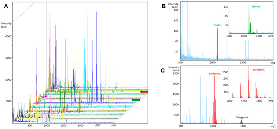 Detection of HELMs in the SI. Panel A, MALDI-TOF analysis of 30 collected individual fractions following RP-HPLC analysis of pooled SI contents from naive mice (n = 3) (Supplementary Figure S5). Lipopeptides were identified in four fractions and representative mass spectra (colored arrows) are shown (B,C); (B) Representative MALDI-TOF spectra of an individual fraction (green arrow in A) containing iturins (highlighted in green). Displayed is a zoomed in mass spectrum of the detected C16IturinA/C16Mycosubtilin/C15BacillomycinF; (C) Representative MALDI-TOF spectra of an individual fraction (red arrow in A) containing surfactins (red) and fengycins (black). Displayed is a zoomed in mass spectrum of the detected surfactins (C12 to C15). Light blue color shows unidentified masses.