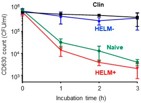 Experiments were conducted using mid-logarithmically growing cultures of CD630 (6 h), dividing the culture into four and adding 1:10 volume of a cell-free supernatant of Bv277 (HELM+) or srfAA- (HELM−). The HELM+ (Bv277) SEC-fractionated ‘active’ fraction was used at a dilution factor of 1:100 (v/v) and PBS was used as a negative control. OD600 measurements were taken hourly. Aliquots were taken hourly, serially diluted in PBS and plated onto ChromID agar to enumerate the viable CFU.