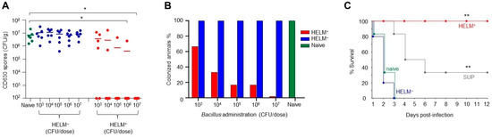 To discern the causal effect that HELM-producing Bacillus exerts upon C. difficile colonization in lieu of other contributing factors, we used a microbiota depletion model where animals are subject to a prolonged multi-antibiotic treatment [55,56]. This approach offers several advantages over a germ-free model, including, but not limited to, the detrimental effect long-term sterility has upon mouse development and immune function [56]. To deplete the pre-existing intestinal microbiota, mice were first treated with an antibiotic cocktail for one week followed by a washout period of two days. During the washout period mice were orally dosed with a range of concentrations of HELM+ or HELM− spores (103 to 107 CFU/dose). The dosages used in this experiment encompass the physiological levels of Bacillus found in the intestine of both mice and humans (~104 to 105 CFU/g) [57]. Higher doses were also used (~106 to 107 CFU/g), as, unlike in a healthy host, HELM-producing Bacillus would be the sole colonization resistance factor present in this model. On the third day post-antibiotic cessation, mice were challenged with 103 CD630 spores and dosing with HELM+ or HELM− spores continued (Figure 6A,B, Supplementary Figure S7A). Analysis of the cecum for correlates of infection showed that the administration of HELM-producing spores prevented C. difficile colonization in a dose-dependent manner. Dosing with 107 CFU HELM+ spores prevented colonization in all mice, with no C. difficile toxin or CFU observed. Mice dosed with 106, 105 and 104 CFU of HELM+ spores demonstrated high levels of colonization resistance, while animals dosed with 103 CFU displayed lower levels. By contrast, administration of HELM− spores had no effect on colonization, regardless of dosage, demonstrating the necessity of HELMs in colonization resistance. To further assess the role of HELM-producing Bacillus in C. difficile colonization resistance, we used a clindamycin challenge model in Golden Syrian hamsters (Figure 6C, Supplementary Figure S7B,C). This hamster model was chosen to mimic the infection process in humans and assess the capability of Bacillus HELMs to prevent colonization. When hamsters were administered HELM+ spores, they showed complete protection against CDI with all animals exhibiting no symptoms of disease 12 days post-challenge together with the absence of both toxins and C. difficile in the ceca (Figure 6C, Supplementary Figure S7B,C). Hamsters dosed with a HELM− strain (Bv378) having no in vitro activity were not protected, with kinetics similar to naive animals. Hamsters dosed with the cell-free HELM+ supernatant showed a delayed onset of CDI symptoms with 2/6 animals surviving.