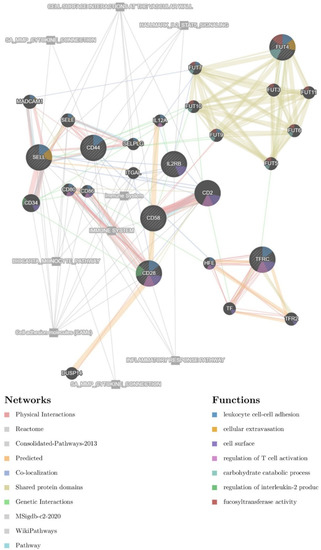 Next, therapy and NF-κB associated CD markers were used as an initial seed for the construction of a regulatory network also containing 20 resultant genes in the GeneMANIA web server. The potential glioma-therapy-related network (GTN) contains 27 genes (Figure 2). Associated pathways are also present in the final network. The resultant genes contain members of the FUT family (including FUT3, FUT5, FUT6, FUT7, FUT9, FUT10, and FUT11), other CD markers (e.g., CD2, CD34, CD80, CD86), and members of the selectin family (e.g., SELE, SELPLG), as well as TF, TFR2, HFE, DUSP14, ITGAL, IL12A, and MADCAM1.
