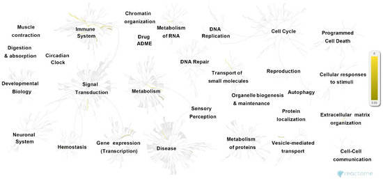 GTN genes were further characterized using two types of enrichment analysis. First, Reactome analysis was performed to provide an overview of the significant pathways and their associations (Figure 3 and Table S2, Supplementary Materials). The analysis revealed the 25 most enriched pathways (summarized in Table 1), most of which can be categorized in terms of highly associated cellular functions.