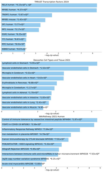Second, Enrichr analysis was performed for the enrichment of GTN genes in gene sets present in specific databases (Figure 4). The top 10 enriched transcription factors in TRRUST Transcription Factor Database version 2019 include several members of the NF-κB family (human RELA, human NFKB1, murine NFKB1, and human IKBKB). Importantly, microglia in the cerebrum and cerebellum are included among the tissues types in which GTN genes are expressed, from the Descartes Cell Types and Tissue Database version 2021. Enriched pathways, from the WikiPathways Database version 2021, among others, include cancer-related pathways (cancer immunotherapy by CTLA4 blockade WP4582; interactions between immune cells and microRNAs in the tumor microenvironment WP4559), immune-system-related pathways (control of immune tolerance by vasoactive intestinal peptide WP4484; allograft rejection WP2328), virus-related pathways (FOXP3 in COVID-19 WP5063; acute viral myocarditis WP4298), and inflammatory response pathway WP453, iron metabolism in placenta WP2007, PI3K/AKT/mTOR-VitD3 signaling WP4141, and 3q29 copy number variation syndrome WP4906.