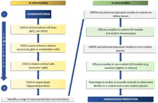 Schematic flow chart of a screening cascade to prove the efficacy of a candidate drug in neonatal HIE. On the left side is depicted a representative test cascade for evaluating the efficacy in in vitro models of increasing complexity (from cell-based to organotypic models) with the aim of defining a range of neuroprotective drug concentrations. Typically, a battery of additional in vitro tests is also used for measurement or prediction of physical properties, drug metabolism, and pharmacokinetic parameters (not fully covered here). Drug metabolism and pharmacokinetic (DMPK) studies, used to understand drug exposure and brain penetration and to define doses, are conducted before progressing to in vivo efficacy studies, shown on the right side. Pharmacodynamic in vivo studies may be required, depending on the mode of action of the candidate drug, before proceeding to efficacy studies. Selected candidate drugs are progressed to studies in rodents (better if two species or different strains and laboratories if using one species such as rat), and subsequently to higher species if feasible, to determine efficacy and the link between target inhibition and neuroprotection. Safety studies in juvenile animals and the determination of the No Observed Adverse Effect Level (NOAEL) in at least two species (rodents and non-rodents) are also required before a candidate drug can be progressed to human studies and the human dose predicted.