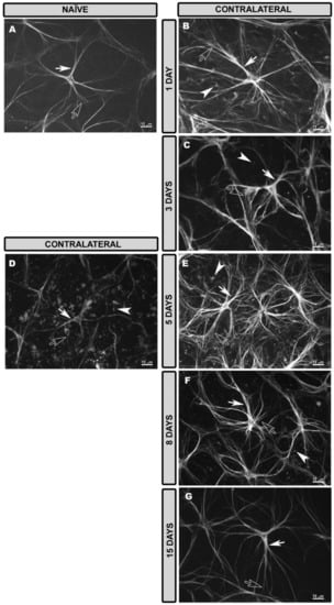 Retinal whole-mount. GFAP immunostaining in naïve eyes and at different time points after OHT induction in contralateral eyes (high magnification). Morphological characteristics of macroglial cells in naïve eyes (A) and contralateral eyes (B–G) at 1, 3, 5, 8 and 15 days after laser treatment. In naïve retinas, astrocytes had stellate shapes with rounded cell bodies and several primary (white arrow) and secondary (hollow arrow) processes (A). In contralateral retinas at 1 (B), 3 (C) and 8 (F) days after laser treatment, astrocytes were reactive with thick somas and numerous primary (white arrow) and secondary (hollow arrow) processes. At 5 days, astrocytes were highly reactive, with a large number of secondary processes (hollow arrow) (E). In areas close to the optic disc, astrocytes with low GFAP intensity were observed, and secondary processes were difficult to observe (D). At 15 days after laser treatment, astrocytes were slightly more reactive (G) than naïve. The end feet (arrowhead) of activated Müller glia were visualized at 1 (B), 3 (C), 5 (E) and 8 (F) days after laser induction. GFAP: glial fibrillary acidic protein; OHT: ocular hypertension.