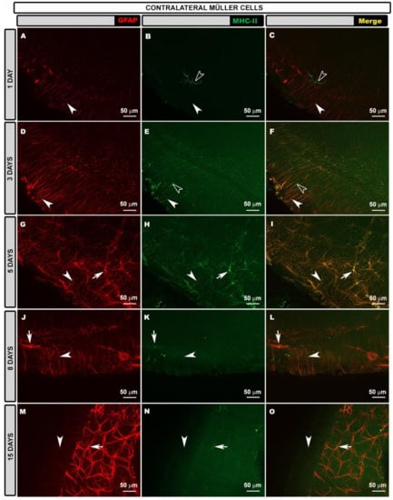 The MHC-II expression in the Müller glia differed according to the time point after laser treatment. At 1 and 3 days after laser treatment (Figure 8B,C,E,F), the expression was very low, increasing after 5 days (Figure 8H,I) and being higher at 15 days (Figure 8N,O). Interestingly, at 15 days after laser treatment, the higher expression of MHC-II by Müller cells coincided with a lower expression of GFAP. Additionally, at this time point, the MHC-II expression was higher in Müller glia than in astrocytes.