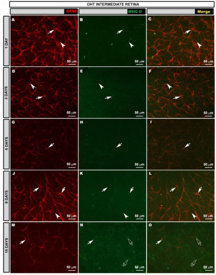 Given the close relationship between the activation of macroglia and microglia and their involvement in the death of RGCs in this pathology, the present work analyzed how the activation of retinal macroglial cells occurred at different time points (1, 3, 5, 8 and 15 days) after the induction of OHT in an experimental model of laser-induced OHT in mice. For this purpose, we used retinal whole-mounts that allowed us to visualize the astroglial plexus throughout the retinal extension, analyzing the GFAP-labeled retinal area, the intensity of GFAP labeling, and the expression of MHC-II in both OHT eyes and normotensive contralateral eyes compared to naïve eyes.