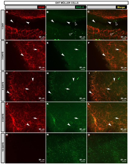 Retinal whole-mount. Double immunostaining for GFAP (red) and MHC-II (green) in Müller glia at different time points after OHT induction in OHT eyes. GFAP-labeled Müller cells are shown at different time points (A,D,G,J,M). MHC-II expression in Müller glia (arrow head) was observed at all time points (1 (B,C); 3 (E,F); 5 (H,I); 8 (K,L); and 15 (N,O) days), being more intense at 15 (N,O) days after laser treatment, being as intense as that of dendritic cells (hollow arrowhead). Arrows point to MHC-II+ astrocytes. GFAP: glial fibrillary acidic protein; MHC-II: major histocompatibility complex class II; OHT: ocular hypertension.