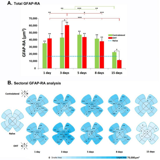 In both OHT and contralateral eyes, there was a significant increase in the total value of GFAP-RA with respect to that for naïve eyes (p < 0.01) at all the time points analyzed (1, 3, 5 and 8 days) except at 15 days, where these differences were not found (Figure 9A). When the total value of GFAP-RA was analyzed for the OHT eyes and their contralateral counterparts, significant differences were only found at Days 3 and 15 after OHT induction (both p < 0.05). While, at 3 days, the GFAP-RA was higher in OHT eyes; at 15 days, it was lower (Figure 9A).
