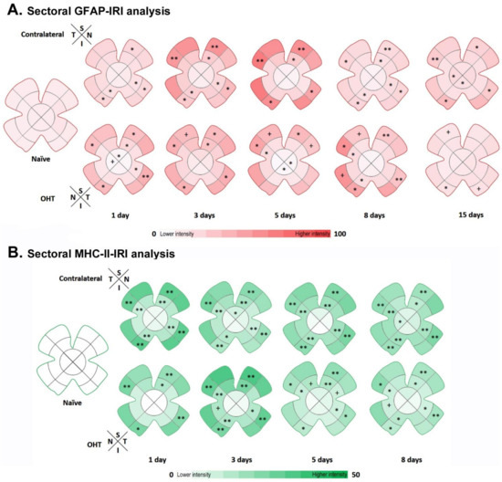 GFAP-IRI and MHC-II-IRI values at different time points after unilateral OHT laser-induction. (A): Colorimetric differences in the GFAP-IRI by retinal sectors in naïve eyes and at different time points after laser treatment (1, 3, 5, 8 and 15 days) in contralateral and OHT eyes. * p < 0.05, ** p < 0.01 OHT vs. naïve and contralateral vs. naïve; Mann–Whitney U test. + p < 0.05 OHT vs. contralateral; Wilcoxon W test. (B): Colorimetric differences in the MHC-II-IRI by retinal sectors in naïve eyes and at different time points after laser treatments (1, 3, 5, and 8 days) in contralateral and OHT eyes. * p < 0.05, ** p < 0.01 OHT vs. naïve and contralateral vs. naïve; Mann–Whitney U test. + p < 0.05 OHT vs. contralateral; Wilcoxon W test. GFAP: glial fibrillary acidic protein; GFAP-IRI: GFAP-immunoreactivity intensity; MHC-II: major histocompatibility complex class II; MHC-II-IRI: MHC-II-immunoreactivity intensity; OHT: ocular hypertension; S: superior; I: inferior; N: nasal; T: temporal.