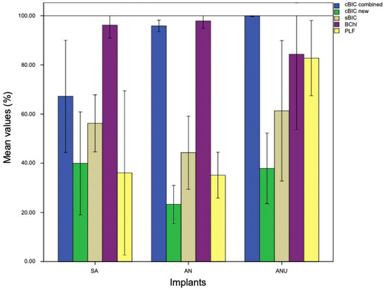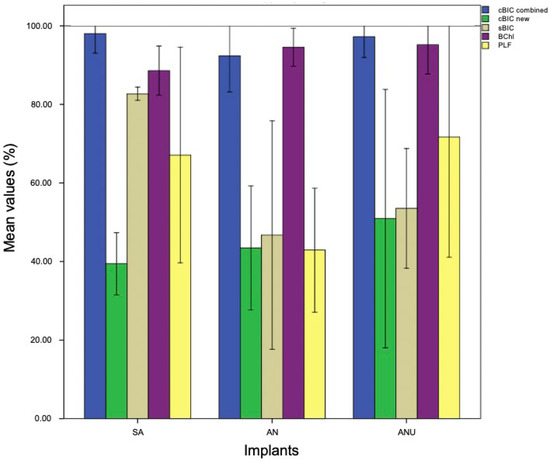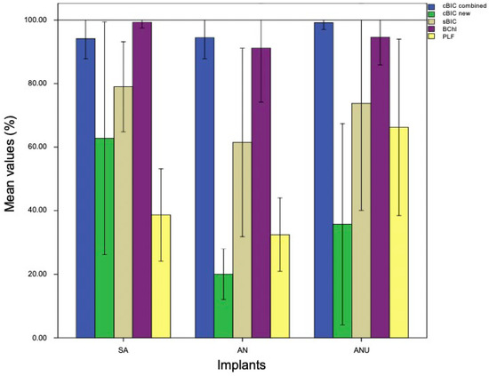 cBIC combined (blue), cBIC new (green), sBIC (sandy), BChI (purple), and PLF (yellow) of the tested implant surfaces SA, AN, and ANU in the rabbit tibia after 2 weeks. x-axis = tested implant surfaces, y-axis = mean values (%) ± SD.