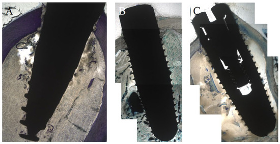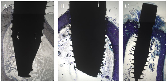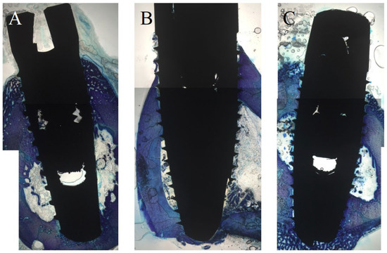 Histological analysis (toluidine-blue) of the tested implant surfaces. (A) SA, (B) AN, (C) ANU in the rabbit tibia after 4 weeks.
