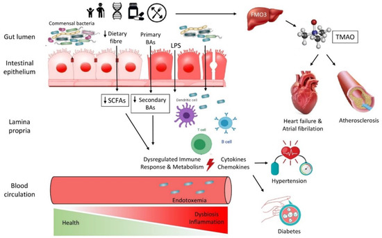 The collection of normally non-pathogenic microorganisms that mainly inhabit our gut lumen shapes our health in many ways. From the neonatal period onwards, the gut microbiota determines the formation of the intestinal architecture [13], and regulates the mechanisms of metabolism and local immunity [14,15,16]. Structural and functional perturbations in the gut microbial pool, known as “dysbiosis”, have been proven to play a vital role in the pathophysiology of several conditions, including inflammatory bowel disease (IBD), obesity, autism, cancer, and cardiovascular disease (CVD) [17,18,19].