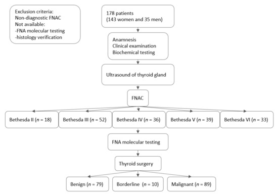 In our prospective cohort study, we included 178 patients (143 women and 35 men) in a country with iodine sufficiency [13]. The patients were consecutively recruited from August 2017 to April 2021. Patient history, biochemical testing, ultrasound of the neck (US), fine-needle aspiration biopsy (FNA), and FNA molecular testing were done at the Institute of Endocrinology and Internal clinic, University Hospital Kralovske Vinohrady. The flowchart of the study can be seen in Figure 1. The protocol of this study complied with the Declaration of Helsinki, and before entering the study, written informed consent was obtained from all patients after they received both written and oral information. The study was approved by the ethical committee of the Institute of Endocrinology.