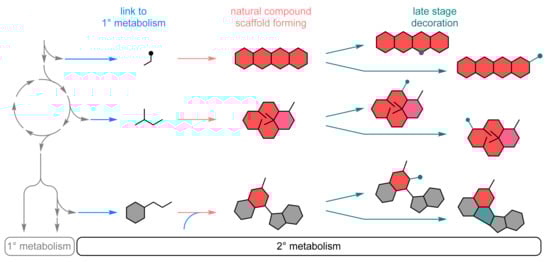 Although the number of secondary metabolites is almost immeasurable, the secondary metabolic pathways run in a similar way (Figure 1). The precursor molecules such as acetyl-CoA, amino acids or glycosides are taken from the primary metabolism, and in one enzymatic step or a few steps, the basic structure of the natural substance is formed []. For example, a terpene cyclase produces terpene backbones [], polyketide synthase machinery produces polyketide structures [] or the phenylpropanoid metabolic pathway starts with the formation of cinnamic acid derivatives by phenylalanine/tyrosine ammonia lyase (PAL/TAL) []. Starting from these basic scaffolds, many natural product derivatives are then decorated in vivo by late-stage decorations, such as the introduction of functional groups (oxyfunctionalization, glycosylation, halogenations, etc.) or the conversion of existing functional groups (eliminations, oxidations/reductions, substitutions).