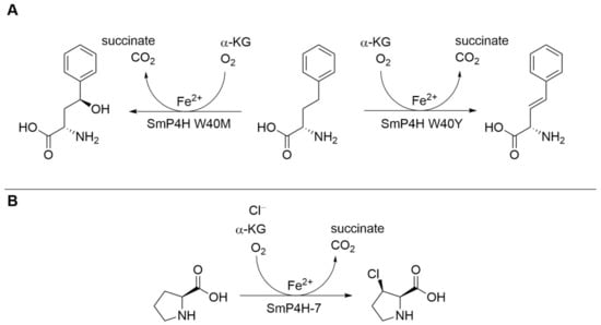 The group of Buller and coworkers made substantial progress in engineering αKGDs and contributed to understanding the structure–function relationship of the enzymes []. They set out to engineer a l-proline cis-4-hydroxylase from Sinorhizobium meliloti for hydroxylation of a novel substrate, the non-proteinogenic amino acid l-homophenylalanine (Figure 5A) []. The respective hydroxylated product represents an intermediate for the synthesis of potential kynureninase or kynurenine monooxygenase inhibitors, which might be of use in the treatment of certain neurodegenerative disorders and cancer. In the study, the W40M/I103L enzyme variant exhibited a >100-fold improved activity and a >300-fold improved catalytic efficiency. Moreover, the turnover number was optimized 10-fold. Interestingly, a single amino acid exchange (W40Y) led to a shift from the hydroxylated product to the desaturated product, showcasing the first αKGD to be engineered from hydroxylase to desaturase activity. In another study, the same L-proline cis-4-hydroxylase was engineered for halogenation of the native substrate (Figure 5B) []. One amino acid exchange (D108G) led to halogenation activity, which was further elevated over several rounds of enzyme engineering. The final enzyme variant SmP4H-7 showed a 12-fold improvement in the activity and a 98-fold improvement in the catalytic efficiency compared to the starting biocatalyst []. The mentioned studies demonstrate the power of enzyme engineering of αKGDs, allowing the conversion of new substrates and even re-programming of the native enzyme reaction.