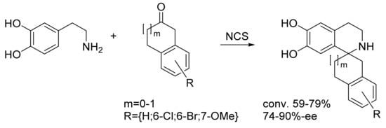 One example is the synthesis of the tetrahydroisoquinolines scaffold, which is the basis for numerous alkaloids such as quinine, strychnine or vinblastine, and is formed by a Pictet–Spengler reaction between an amine like dopamine and a carbonyl [,]. The newly formed N-heterocycle moiety is built up by both, a C–N- and a C–C-coupling, including a newly formed stereogenic center. The natural alkaloids are formed from aldehydes. However, Hailes and colleagues developed mutants of the norcoclaurine synthase that also accept ketones or even cyclic ketones, resulting finally in spiro-tetrahydroisoquinolines bearing a quaternary stereogenic center (Figure 6) []. This complex ring structure is formed within one step with good to moderate yields and the enantiomeric excesses were still sufficiently controlled by these enzyme variants.