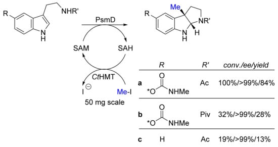 Methylations occur rather often in secondary metabolism, usually as late-stage functionalization. In the case of the physostigmine biosynthesis, the methylation of tryptamine leads to the formation of an additional pyrrolidine ring as a subsequent reaction. The most striking feature here is the formation of a C–C-coupling yielding, simultaneously, a quaternary stereogenic center with high stereoselectivity (Figure 7) []. Schneider et al. were able to demonstrate the flexibility of this methylase for various substrates. The methyl group originates from S-adenosyl methionine, which is both, unstable and expensive. This drawback for an in vitro reaction could be circumvented by applying a cofactor recycling that employs iodomethane, rather than ATP or other costly co-substrates []. This reaction scheme allows for the synthesis of various physostigmine congeners, while physostigmine is known to be an acetylcholine esterase inhibitor [,,].