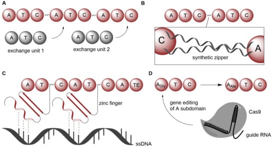 Moreover, alignments of interdomain linker regions from NRPS found in Photorhabdus and Xenorhabdus bacteria led to the identification of fusion positions between C and A domains that can be exploited for the assembly of customized NRPS []. The necessary building blocks are referred to as exchange units (XUs) and consist of three domains (A–T–C or A–T–C/E). By obeying few compatibility rules, the fusion of different XUs leads to functional NRPS (Figure 10A) that produce novel peptides with acceptable yields [,]. The combinatorial concept underlying XUs (Figure 10A) could be developed even further after the discovery of a highly conserved fusion point inside the C domains. By merging appropriate NRPS parts at these sites, highly specific and efficient peptide synthetases can be generated []. Despite this progress, the construction of chimeric NRPS was still quite laborious. The cloning of the required DNA constructs had to deal with the giant size of NRPS biocatalysts and with repetitive sequence stretches alike. To reduce the complexity of these systems, their splitting into discrete, yet functional subunits was thus desirable. This goal was eventually achieved by furnishing the previously defined XUs with synthetic peptide sequences that can interact with each other via a coiled-coil structural motif []. With the help of such synthetic zippers (SZs; Figure 10B), a new type of NRPS architecture has been established that is both productive and easy to handle in the laboratory []. An interesting alternative to the use of SZs is to endow split NRPS modules with zinc finger tags []. In this way, DNA-templated NRPS can be engineered (Figure 10C), which enables a sequence-controlled biosynthesis of tailored peptides [].