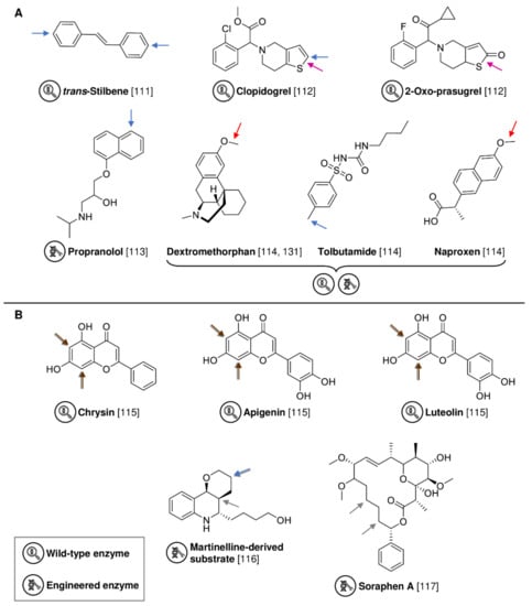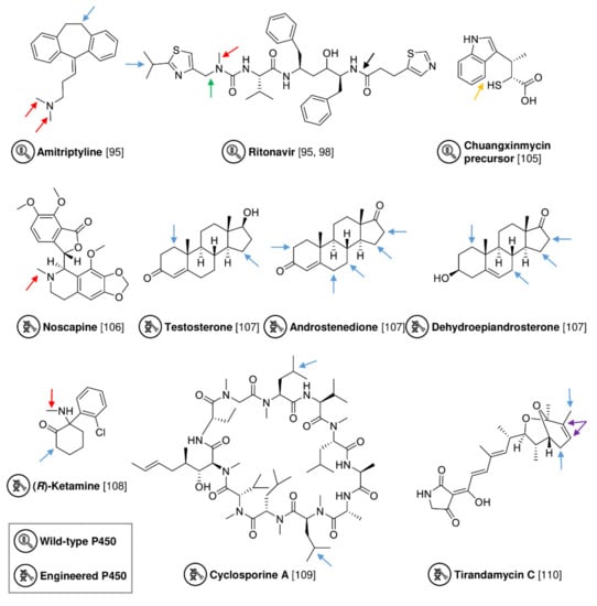 Functionalization of mentioned substrates by wild-type or engineered P450s. Oxidation sites are highlighted with a colored arrow representing hydroxylation (blue), demethylation (red), dealkylation (green), decarbamoylation (black), C-S bond formation (yellow) or epoxidation (purple).