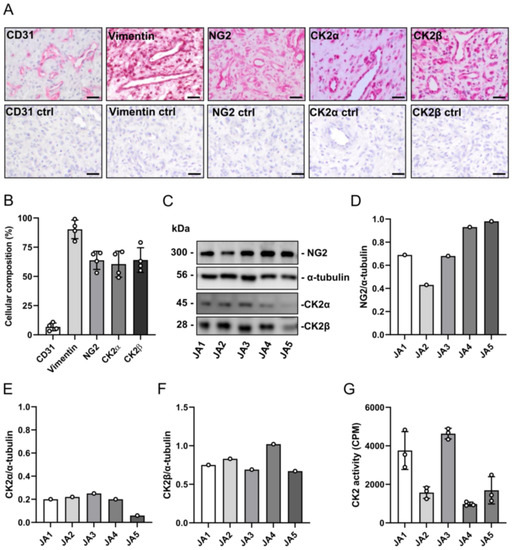 Moreover, we investigated the expression of CK2 and NG2 in five patient-derived JA tissue samples (JA1–JA5). All the tissue samples expressed the catalytic CK2α subunit, the regulatory CK2β subunits and the surface protein NG2 (Figure 1C–F). We additionally analyzed CK2 kinase activity, which was detected in all the patient-derived tissue samples (Figure 1G). Of note, the expression pattern and activity of CK2α and CK2β markedly differed between the individual tissue samples.