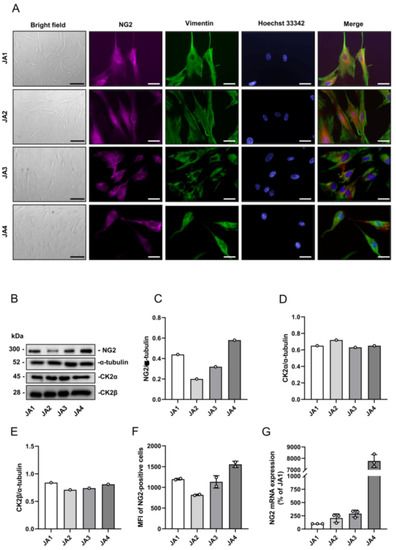 To study the influence of CK2 inhibition on NG2 expression in vitro, we additionally established cell cultures from the patient-derived JA1–JA4 tissue samples. The cells exhibited a fibroblast-like, multipolar shape in bright-field microscopy (Figure 2A). Immunofluorescence stainings demonstrated that the cells were positive for NG2 and for the intermediate filament protein vimentin (Figure 2A). Further Western blot analyses revealed that the cells from JA1–JA4 express NG2 as well as CK2α and CK2β (Figure 2B–E). We additionally verified NG2 protein expression in all the tissue samples by flow cytometry and NG2 gene expression by qRT-PCR analyses (Figure 2F,G).