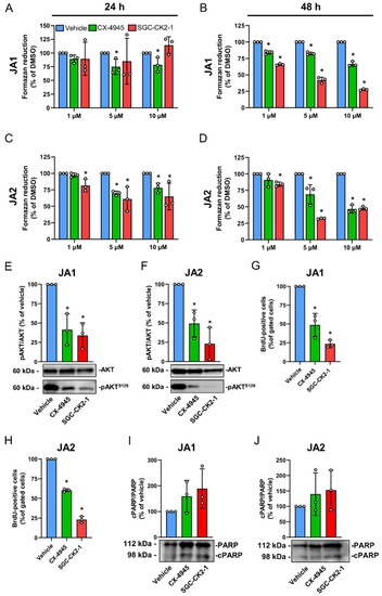 CK2 inhibition suppresses the proliferation of the JA cells. (A–D) The JA1 and JA2 cells were treated with the indicated concentrations of CX-4945 and SGC-CK2-1. The mitochondrial activity was measured by a WST-1 assay after 24 h and 48 h. Vehicle-treated cells served as controls and were set at 100%. Mean ± SD (n = 3). * p < 0.05 vs. vehicle. (E,F) The JA1 and JA2 cells were treated with CX-4945 (10 μM) and SGC-CK2-1 (5 μM) for 48 h. Vehicle-treated cells served as controls. The cells were lysed and the expression of AKT and pAKTS129 was assessed by Western blot. The relative density ratio of pAKTS129/AKT was determined and the vehicle-treated cells were set at 100%. Mean ± SD (n = 3). * p < 0.05 vs. vehicle. (G,H) JA1 and JA2 were treated as described in (E,F) and the incorporation of BrdU was analyzed by flow cytometry. The BrdU-positive cells were expressed to all the gated cells and the vehicle-treated cells were set at 100%. Mean ± SD (n = 3). * p < 0.05 vs. vehicle. (I,J) The JA1 and JA2 cells were treated with CX-4945 (10 μM) and SGC-CK2-1 (5 μM) for 48 h. Vehicle-treated cells served as controls. The cells were lysed and the expression of AKT and pAKTS129 was assessed by Western blot. The relative density ratio of cPARP/PARP was determined and the vehicle-treated cells were set at 100%. Mean ± SD (n = 3).