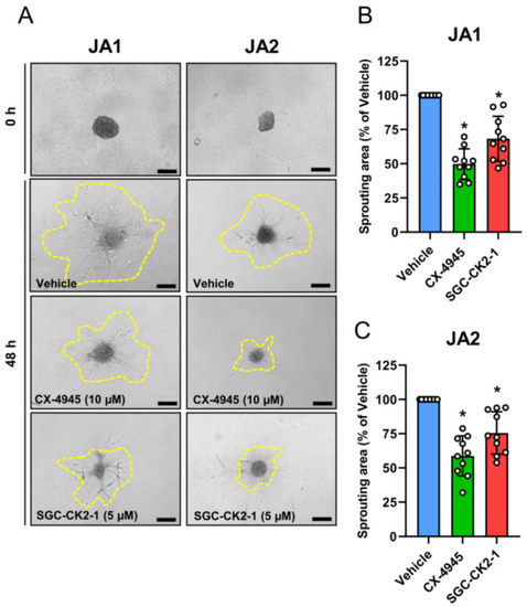 The binding of NG2 to proteins of the ECM triggers cell migration [12,32,33]. To analyze the influence of CK2 on NG2-dependent JA cell migration, we finally performed a collagen sprouting assay. For this purpose, 500 JA1 or JA2 cells were cultivated by using the liquid overlay technique to generate spheroids, which were subsequently embedded within a collagen matrix. The sprouting capacity of the cells was assessed over 48 h. We found that the cells of the vehicle-treated JA1 and JA2 spheroids rapidly grew out. This outgrowth was more pronounced in the JA1 spheroids compared to the JA2 spheroids (Figure 5A). Notably, in both groups, CK2 inhibition with CX-4945 or SGC-CK2-1 significantly reduced the sprouting capacity of the spheroids (Figure 5B,C).
