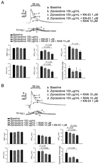 Effects of ziprasidone on action potentials of rabbit atriums. (A): (Upper) Representative action potentials and contractile forces from atrial tissues treated with ziprasidone, combined with KN-93 or KN-93 plus ranolazine, and (below) the mean data (N = 7) during electrical stimulation at a rate of 2 Hz. (B): (Upper) Representative action potentials and contractile forces from atrial tissues treated with ziprasidone, combined with ranolazine or ranolazine plus KN-93, and (below) the mean data (N = 7) during electrical stimulation at a rate of 2 Hz.