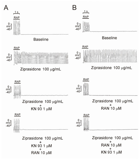 While antipsychotics’ involvement in atrial arrhythmias has not been well investigated, a national database analysis demonstrated that exposure to antipsychotics, especially SGAs, increased the occurrence of AF [8]. While antipsychotic-treatment-associated QT prolongation, which produces an increased rate of SCD, is one of the major concerns in psychiatric patients, AF has been shown to facilitate the induction of ventricular arrhythmias, which, in turn, increases the risk of SCD [9,10]. However, the mechanism for ziprasidone-induced atrial arrhythmias, especially in terms of cardiomyocyte ionic regulation and Ca2+ cycling, remains poorly understood, and further investigation is needed [5].