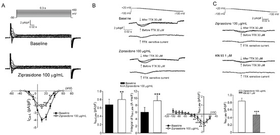ICa,L and INa,L. (A): (top and middle section) Representative traces of ICa,L in atrial myocytes with or without ziprasidone and (bottom section) the I–V relationship (n = 9/3; ** p < 0.01; *** p < 0.005). (B): (top and middle section) Representative traces of INa,L (TTX-sensitive current) in atrial myocytes with or without ziprasidone, and (bottom section) the mean data of INa,L and the integral of INa,L and the IV relationship (n = 9/3; * p < 0.05; ** p < 0.01). (C): (top and middle section) Representative traces of INa,L in ziprasidone-treated atrial myocytes with or without KN-93, and (bottom section) the mean data (n = 13/3; *** p < 0.005).