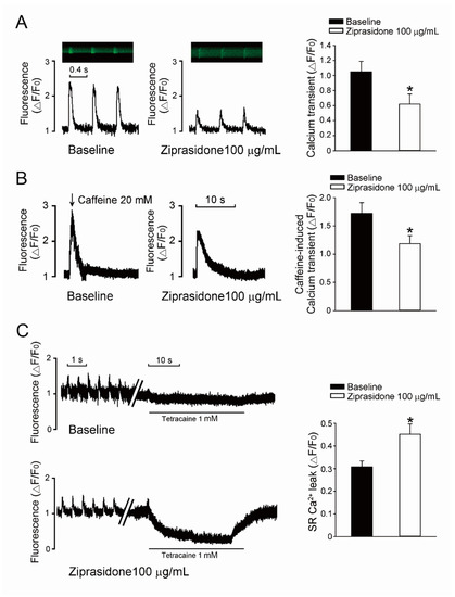 Next, we examined if the intracellular Ca2+ regulation machinery was attenuated by ziprasidone. The steady-state Ca2+ transient amplitudes in atrial myocytes were smaller after treatment with ziprasidone (* p < 0.05, Figure 4A). Ziprasidone-treated myocytes showed decreased SR Ca2+ stores, which were assessed based on the Ca2+ transient elicited by rapid caffeine application (* p < 0.05, Figure 4B) and increased SR Ca2+ leakage (* p < 0.05, Figure 4C).