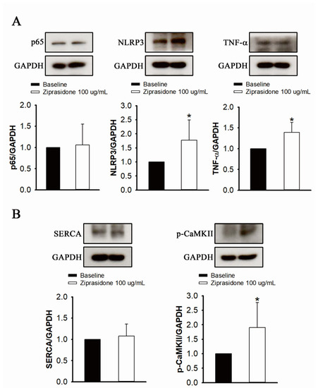 While the protein levels of NF-κB (p65) did not change in ziprasidone-treated myocytes, the expression of TNF-α and NLRP3 was upregulated (Figure 6A). Ziprasidone-treated myocytes showed no changes in the protein level of SERCA2a, but an increase in the protein level of phosphorylated CaMKII was observed (Figure 6B).