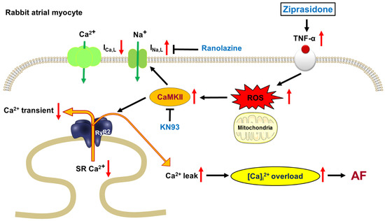 In this study, we used rabbit atrial tissues and isolated cardiomyocytes to assess whether ziprasidone promoted atrial arrhythmias and altered myocyte Ca2+ and Na+ homeostasis. Our data demonstrate that ziprasidone provoked post-RAP atrial triggered activities, which were suppressed by KN-93 and ranolazine. Ziprasidone reduced the ICa,L and enhanced the INa,L, as well as increased the intracellular Na+ level. Ziprasidone decreased the Ca2+ transient and SR Ca2+ stores, increased SR Ca2+ leakage, and enhanced both cytosolic and mitochondrial ROS production in atrial cardiomyocytes. TNF-α/NLRP3 inflammasome signaling was upregulated in ziprasidone-treated myocytes. These results suggest that ziprasidone impairs the regulation of Ca2+, enhances oxidative stress, and activates inflammatory signaling, which leads to the occurrence of arrhythmic events in atriums. These findings help to elucidate the mechanisms underlying atrial arrhythmias associated with ziprasidone treatment (Figure 7).
