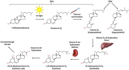 Vitamin D’s chemical structure, synthesis and metabolism were reviewed in []. In brief, it was initially discovered in 1919 by Edward Mellanby [] as a micronutrient able to prevent rickets in dogs. Vitamin D is the common name assigned to a family of members, but usually refers to the precursor form vitamin D3 or cholecalciferol. Vitamin D3 is produced in the skin by a photolytic effect of UV light on 7-dehydro-cholesterol to produce previtamin D3 and by a subsequent thermal isomerization to produce vitamin D3. Vitamin D can also be obtained in the diet either as vitamin D3 from an animal origin or vitamin D2 (ergocalciferol) from vegetal and fungal origins. Vitamin D3 is further processed into 25-hydroxyvitamin D3 in the liver by the enzyme vitamin D3-25-hydroxilase, codified by the gene CYP2R1.