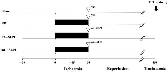 The group of the experimental protocol included the sham operation control group, where the surgery was performed without left anterior descending (LAD) coronary artery ligation in the sham group. In the I/R group, rats were subjected to LAD ligation for 30 min and reperfusion for 120 min. In treatment groups, 50 μg of recombinant human SLPI (wt-SLPI) or mutant rhSLPI (mt-SLPI) in 1 mL of phosphate buffer saline (PBS) was administered by intravenous injection at the onset of reperfusion.