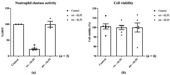 Determination of the enzymatic activity of neutrophil elastase in the presence of wild-type(wt) or mutant(mt) SLPI (a), cell viability after treated with wt-SLPI and mt-SLPI (b) (* p < 0.05 vs. control).