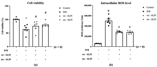 Determination of percentage of cell viability (a) and intracellular ROS (b) under H/R condition and treated with wt-SLPI and mt-SLPI (* p < 0.05 vs. control) (# p < 0.05 vs. H/R).